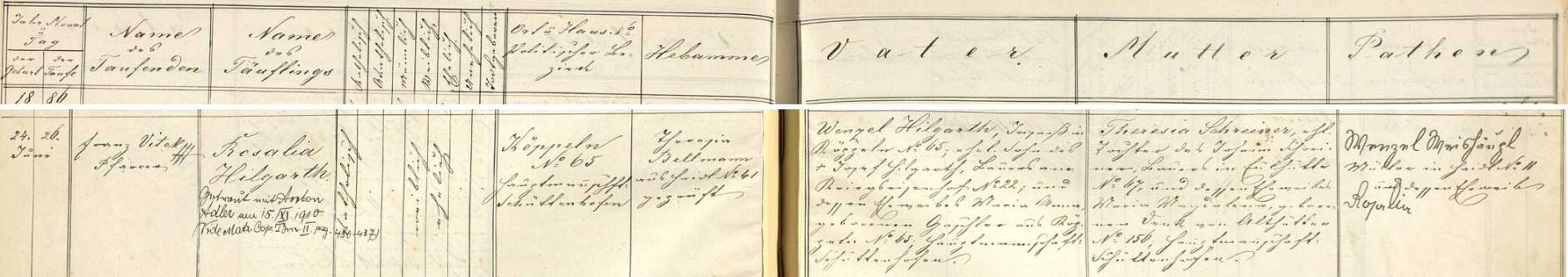 Záznam o narození manželčině v křestní matrice obce Zhůří Repro SOA v Plzni - Porta fontium |