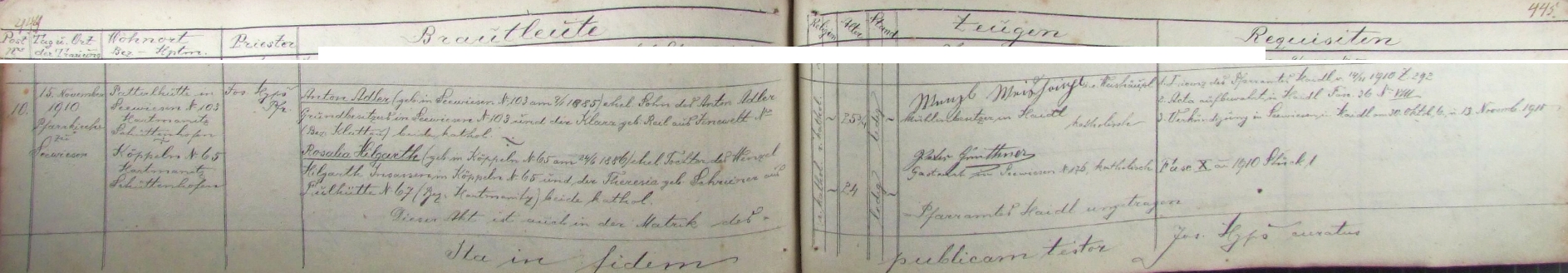 Záznam o jeho narození v křestní matrice farní obce Zejbiš (Javorná) s přípisem o svatbě Repro SOA v Plzni - Porta fontium |