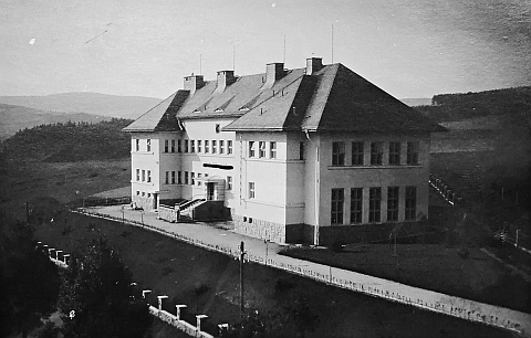 ![]() Novostavba dodnes fungující české školy z roku 1938, tedy z roku, kdy Čachrov opustil, na pohlednici Bohumila Čuby - český nápis je na ní začerněn Repro www stránky Akro.cz |