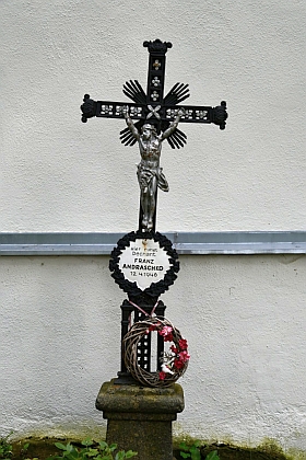 O faráři Franzi Andraschko a jeho rodném stavení na Kamenné Hlavě u Českých Žlebů (viz i Karl Suchy) Repro L. Němec, Krásná Hora : Schönberg im Böhmerwald : historie zapomenuté tkalcovské vsi (2015), s. 136-137 |