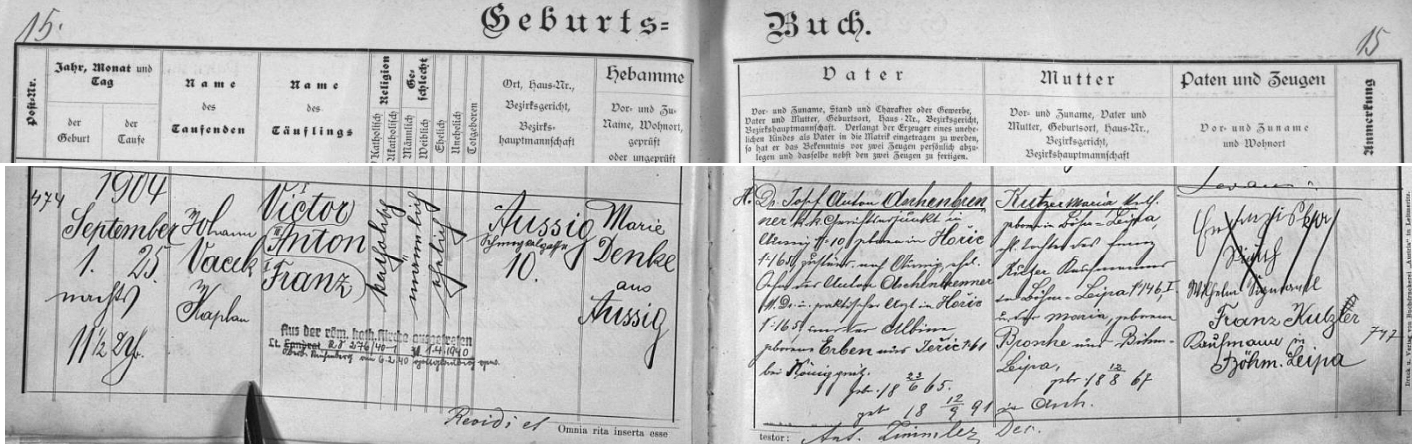 Záznam o jeho narození v křestní matrice Ústí nad Labem s přípisem o vystoupení z katolické církve |