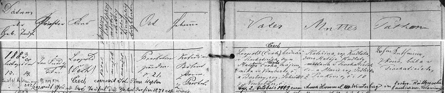 Záznam o jeho narození v prachatické křestní matrice s přípisem o svatbě Repro SOA v Třeboni - digitální archív |