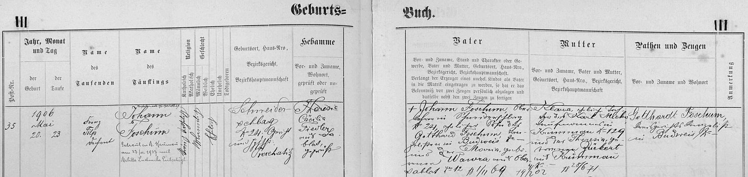 Záznam křestní matriky farní obce Záblatí (Obersablat) o narození otcově dne 1. listopadu roku 1869 (téhož dne byl i pokřtěn farářem Josefem Stürzlem) ve zdejším domě čp. 12 tehdejšímu feldvéblovi (šikovateli) 11. pěšího regimentu korunního prince Alberta von Sachsen Gotthardu Foschumovi (synu Josefa Foschuma, podruha v Řepešíně čp, 24, a Theresie, roz. Kollerové z Řepešína čp. 21) a jeho ženě Marii, dceři ševce v Záblatí čp. 12 Jakoba Wawry a Marie, roz. Moserové ze Záblatí čp. 12 Repro SOA v Třeboni - digitální archív |