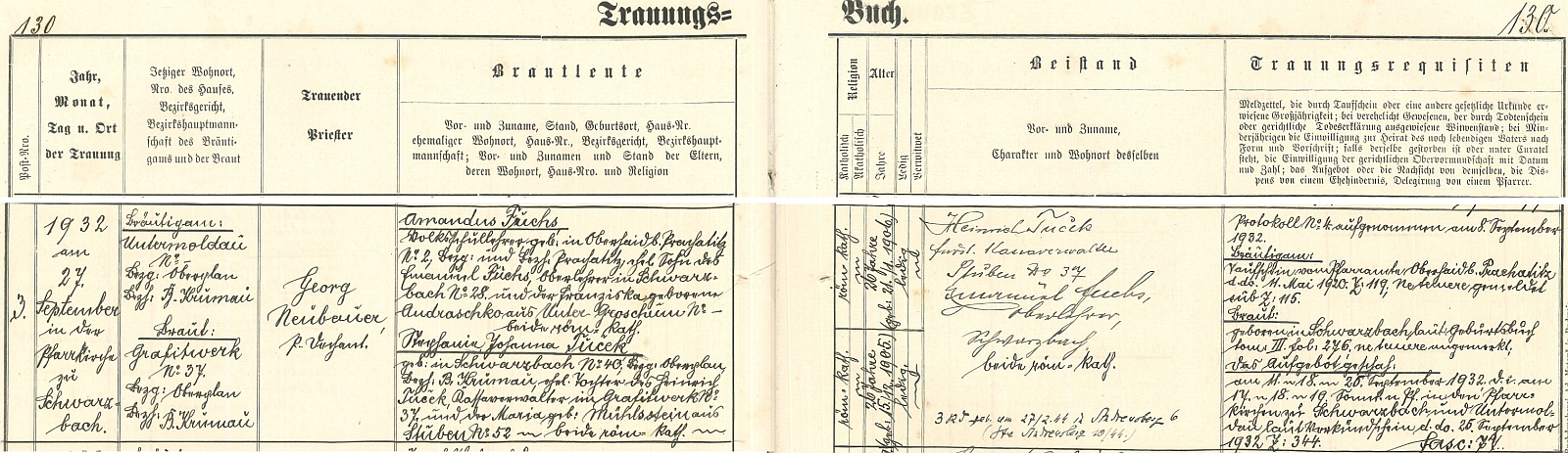 Záznam o svatbě v knize oddaných Černé v Pošumaví Repro SOA v Třeboni |