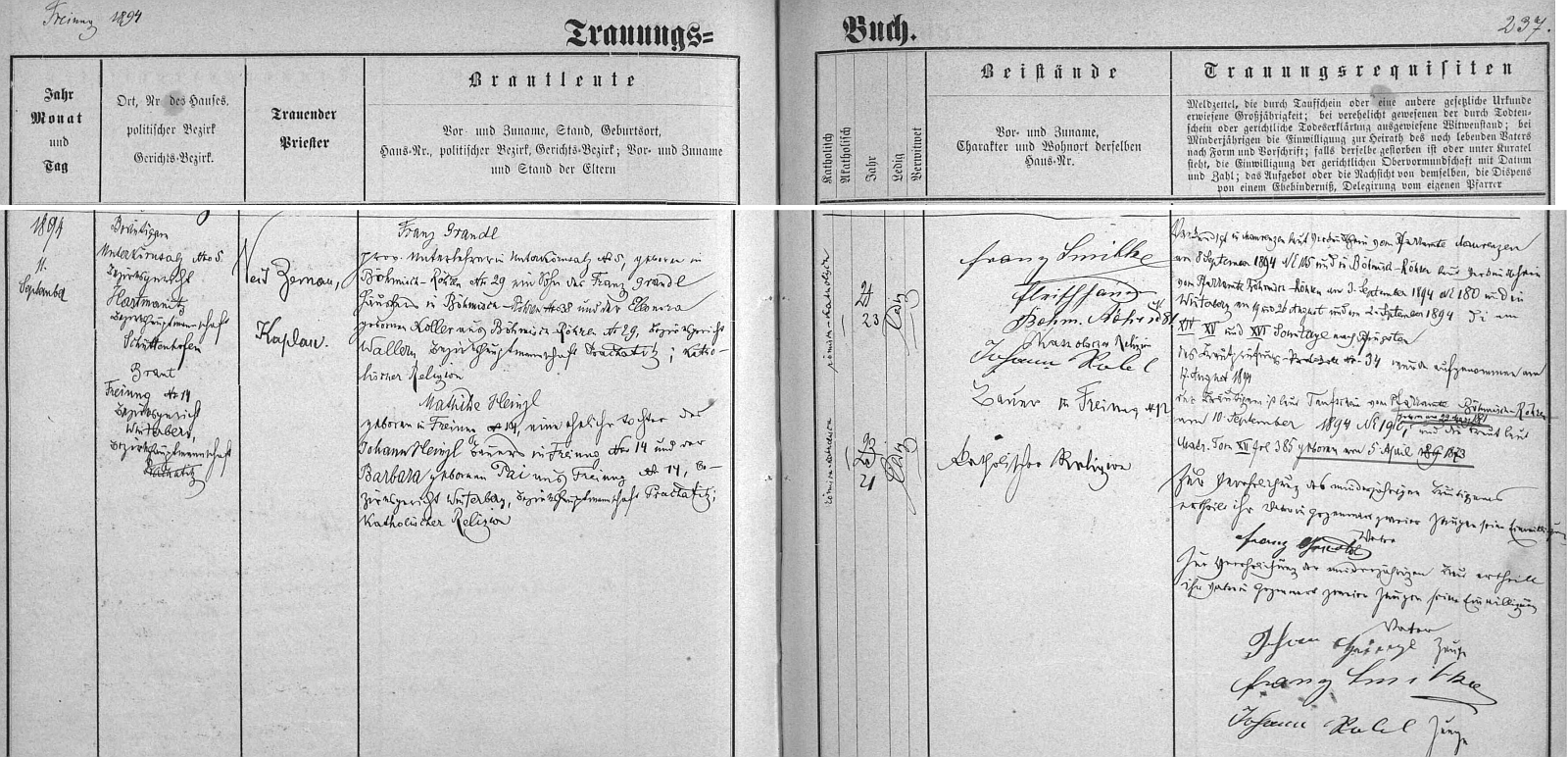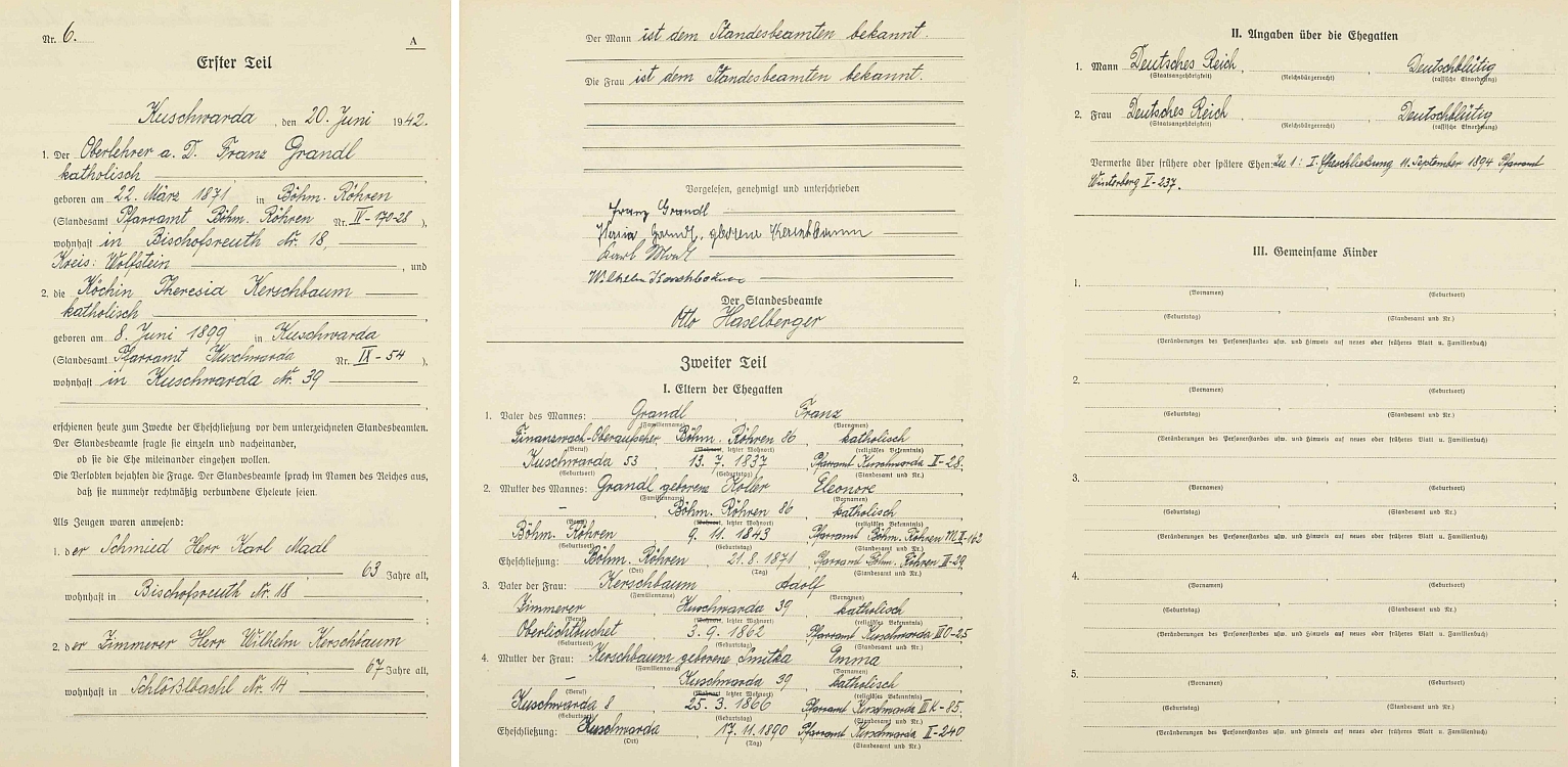 Záznam o první svatbě ve vimperské knize oddaných Repro SOA v Třeboni - digitální archív |