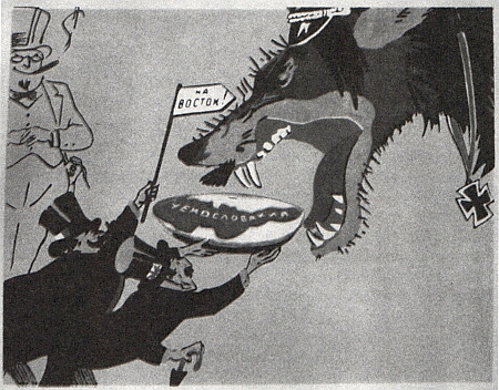 ![]() Karikatura autorů Kukryniksy v sovětském tisku z roku 1938 zpodobuje mnichovskou "dohodu" takto - rok před dohodou Stalina s Hitlerem Repro Sudetenland, 2018, č. 3, s. 300 |