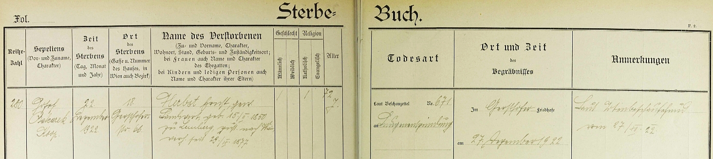 Záznam o jeho úmrtí v knize zemřelých vídeňské farnosti Gersthof Repro Matricula Online |