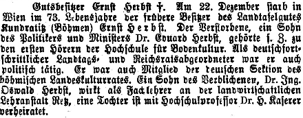 ![]() Stručný nekrolog v rakouských "zemědělských" novinách Repro Wiener Landwirtschaftliche Zeitung, 6. 1. 1923, s. 5 (ANNO - AustriaN Newspapers Online) |