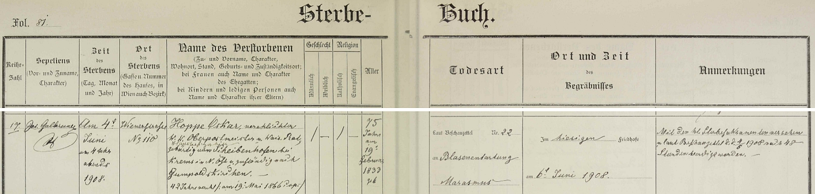 Záznam o sestřině úmrtí v knize zemřelých vídeňské farnosti Hetzendorf, místo narození má být správně Końskie Repro Matricula Online |