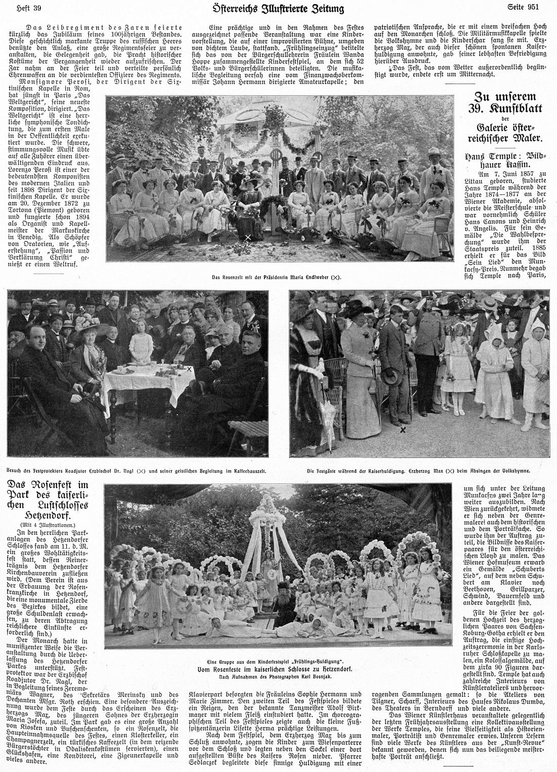 Stránka ve vídeňském týdeníku o "Slavnosti růží" v Hetzendorfu, na jejímž programu se podílela - snad je zachycena na některém ze snímků Repro Österreichische Illustrierte Zeitung, 1911, č. 39, s. 951 (ANNO - AustriaN Newspapers Online) |