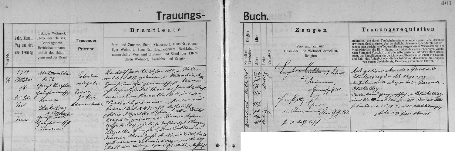 Záznam o svatbě v českokrumlovské knize oddaných, učil tehdy v Dolní Vltavici a bydlel na čp. 22 Repro SOA v Třeboni - digitální archív |