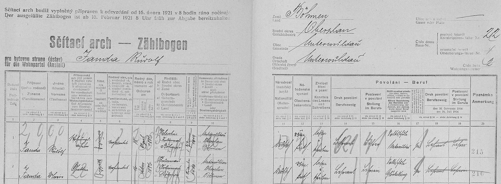 Datum narození potvrzuje i dolnovltavický arch sčítání lidu Repro Sčítání lidu 1921, Dolní Vltavice, SOkA Český Krumlov (SOA v Třeboni - digitální archív) |