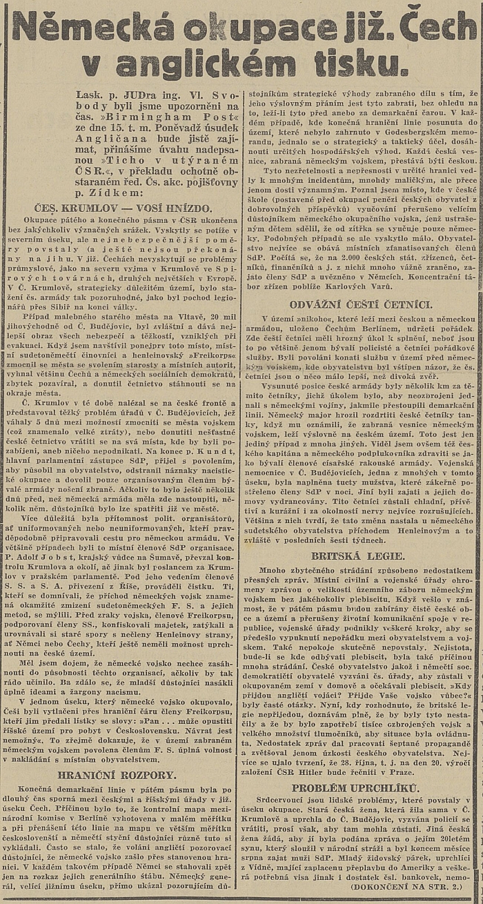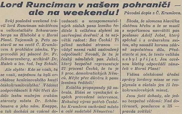 Tady se ocitl na úvodní straně českobudějovicého listu z konce října osudového roku 1938 jako vedoucí osoba řádění Freikorpsu v čerstvě okupovaném Českém Krumlově coby součást citace britského tisku Repro Českobudějovické noviny, 1938, č. 43, s. 1 |