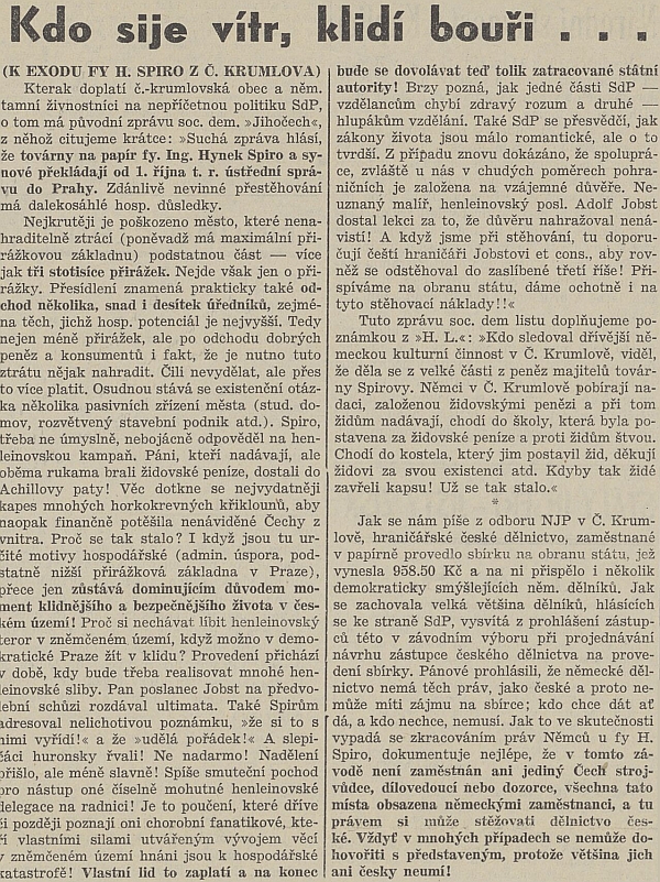 V takřka prorockém článku Českobudějovických novin z počátku srpna roku 1938 je řeč o Jobstově štvaní proti rodině Spirově a o jejím eexodu do Prahy Repro Českobudějovické noviny, 1938, č. 30, s. 3 |