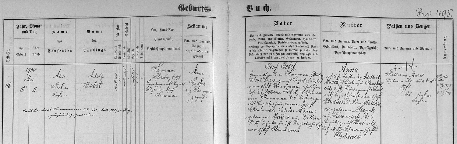 Záznam o jeho narození v českokrumlovské matrice Repro SOA v Třeboni - digitální archív |