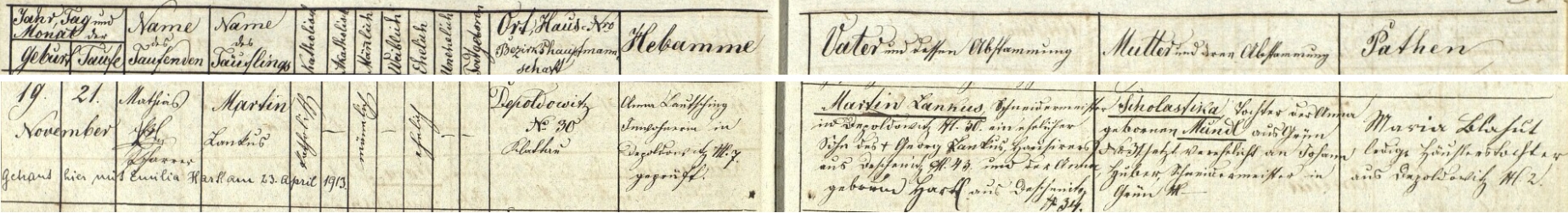 Záznam o jeho narození v děpoltické křestní matrice s přípisem o svatbě