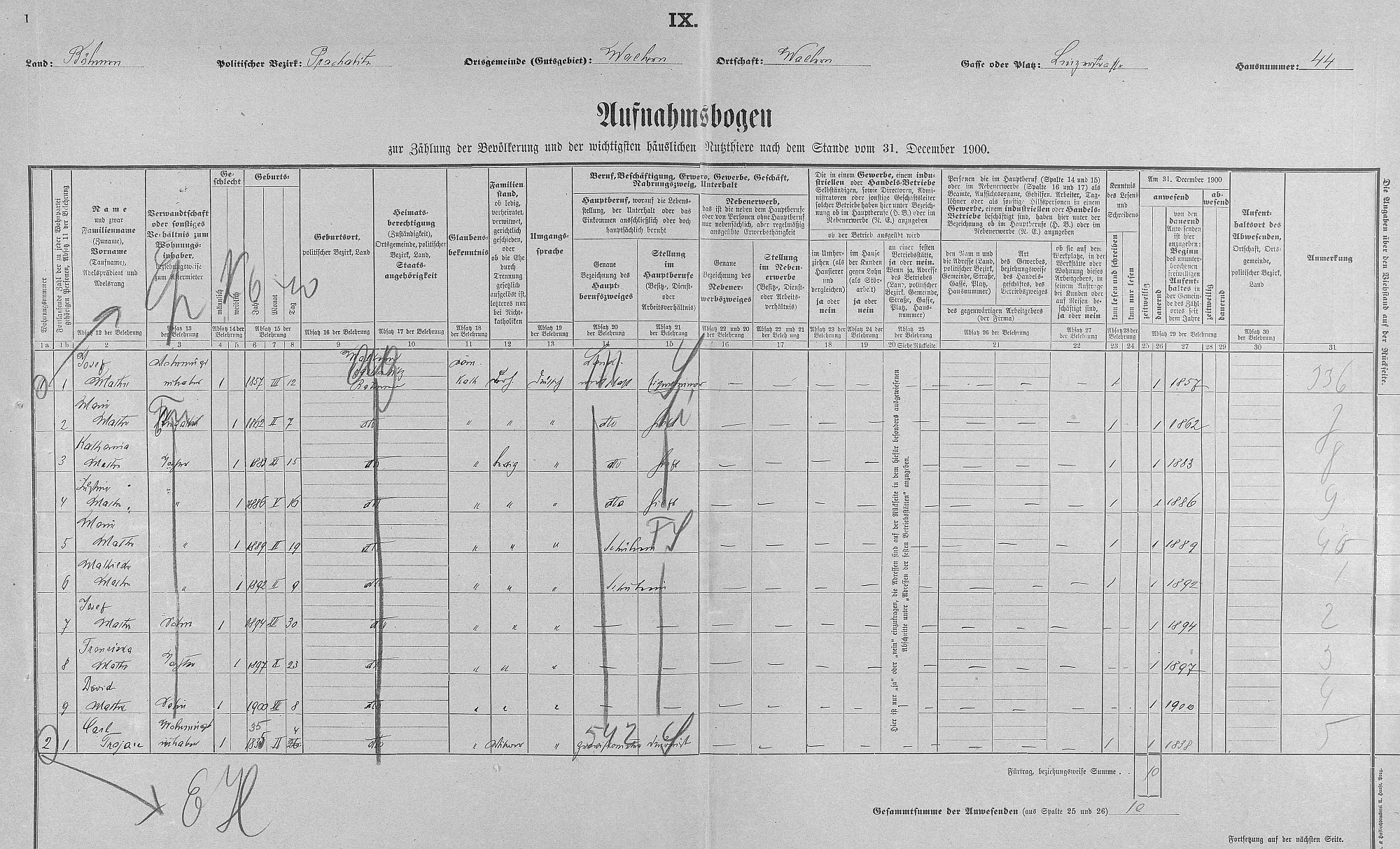 Arch sčítání lidu z roku 1900 pro dům čp. 44 ve Volarech i s ním Repro Sčítání lidu 1900, Volary, SOkA Prachatice (SOA v Třeboni - digitální archív) |