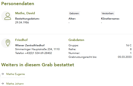 ![]() Záznam v databázi vídeňských hřbitovů Repro www stránky Friedhoefe Wien - verstorbenensuche) |