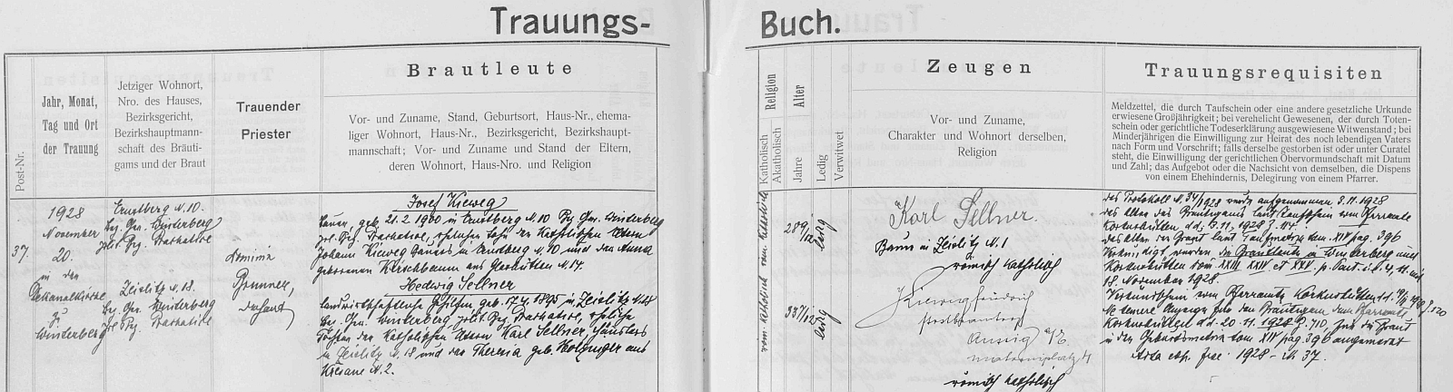 Záznam o svatbě rodičů ve vimperské oddací matrice Repro SOA v Třeboni - digitální archív |