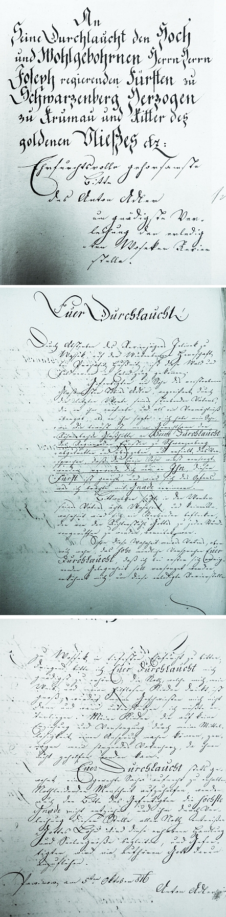 Adlerova vlastnoruční podepsaná žádost knížeti o místo revírníka v Osekách, datovaná v Pavinově 5. října roku 1816 Repro SOA v Třeboni, pobočka Český Krumlov, Schwarzenberská ústřední kancelář, střední oddělení B7J 4a, karton 1316 (1802-1836) |