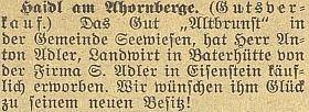 ![]() Originál zprávy o rozmnožení rodinného majetku... Repro Budweiser Zeitung, 1929, č. 19, s. 9 |