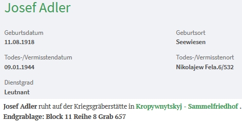 ![]() Záznam o synu Josefovi v databázi padlých německých vojáků |