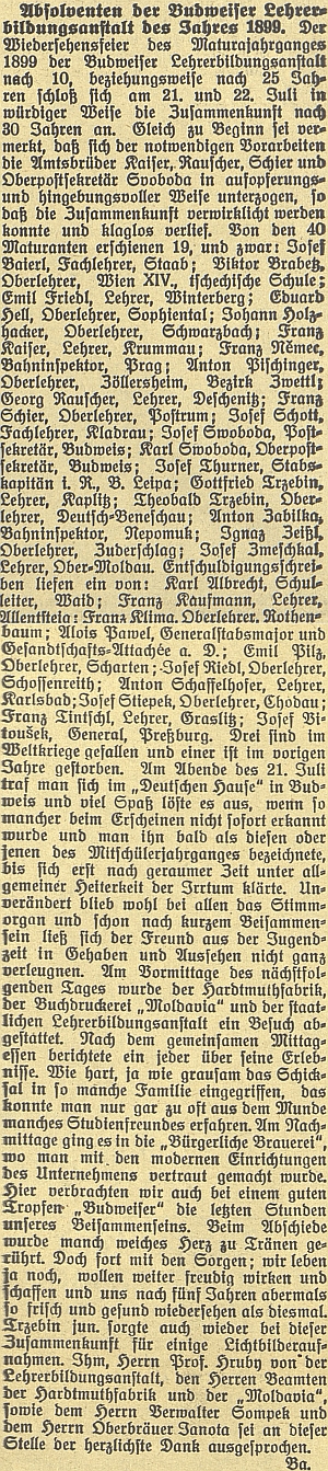 Celý text článku o setkání absolventů českobudějovického učitelského stavu Repro Budweiser Zeitung, 1929, č. 58, s. 5 |