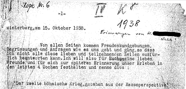 Pokud jste dočetli až do konce, zní ten obludný text nejen českému čtenáři přímo jako "corpus delicti" (vlastně už co do způsobu formování oddílů Freikorps) "přeshraniční" vynucené předehry nacistického válečného zločinu, a to jako soudní přímo doklad cíleného prologu nikoli snad nějaké "české", nýbrž rovnou světové války, jak ji později ve své dokumentární oktalogii Německá válka I-VIII (1945!) "německou" nazval spisovatel Emil Vachek. Zjednodušeně to nějaký daleko pozdější český politik vyjádřil slovy, že "Beneš je, rozuměj sudetské Němce, do války neposlal, Hitler ano". K tomu lze připočíst divoký nacistický antisemitismus, zde vyjádřený spojením "Židé a Češi". Však také je pro poučení obelhané kdysi německé veřejnosti i do budoucna ta vimperská "zaječí" vzpomínka součástí sbírky "Lexika und Dokumentationen" oficiální instituce Spolkové republiky Německo "Bundesinstitut für Kultur und Geschichte der Deutschen im östlichen Europa", z níž připojuji i překlad komentáře, téměř po 80 letech k dokumentu připojeného. Tady je autorka textu označena jako "Frau H. St." (na strojopisném německém originále je jméno začerněno a kýmsi pod ním připsáno "Nichte?"). Dívka, či zralá žena, tak jako tak zcela se poddávající dobové a později tak krutě zklamané euforii? Neteř, ale čí? Kdo je třeba její bratr, který se vrací z Teplic "domů"? Kdo je její matkou? Jak to, že jejími strýci jsou jak "Rupp" (možná dvojí, starší i mladší), tak "Hans" Steinbrenerovi? V jakém vztahu jsou k ní "rodiče Hauenschildovi"? Je jejich dcerou či vnučkou? V každém případě jde u "Frau H. St." o některou z mladších žen rodiny Steinbrenerových, kteří ovšem jako vydavatelé katolických kalendářů a modlitebních knih nemohli mít u nacistů nijak jistou podporu (tím textem na způsob nějakého slohového cvičení jako by se o ni přímo cíleně usilovalo), navíc když byli spřízněni s původně židovskou rodinou Waldekových (Wotzasekových). Manželka Hanse Thomase Steinbrenera Anna Auguste, roz. Hauenschildová (v roce 1938 jednačtyřicetiletá, měla s mužem dva syny a šest dcer, všechny ovšem až po mnichovské svatbě roku 1922, tj. nejvýše patnáctileté), byla zároveň sestrou Bruna "rytíře" von Hauenschild, jenž se jako velitel tankové jednotky podílel na obsazení "Sudet" a pak i zbytků Československa a už v generálské hodnosti byl těžce raněn v bojích o Stalingrad. na konci války pak měl radit Steinbrenerovým při opuštění Vimperka (tady by se spíš hodila metafora se "zaječí perspektivou"), kde stál sestřin manžel v čele Volkssturmu, ale s bílým praporem vydal město bez boje Američanům. Taková už je historie Šumavy v osudném dvacátém století. Nijaký lidský osud však trvale nestrpí úplnou anonymitu, jak věřím.