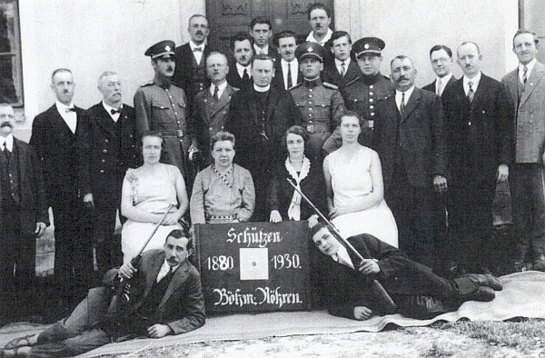 ![]() Na fotografii střeleckého spolku v Českých Žlebech stojí v zadní řadě prvý odleva Repro H. Pollak, Heimat Böhmisch-Röhren : Entstehung - Geschichte - Vertreibung (2009), s. 167 |