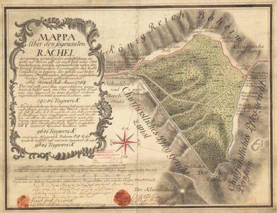 ![]() Stará lesnická mapa Roklanu s hranicemi království Českého a kurfiřství Bavorského z roku 1764, kdy byla uzavřena hraniční smlouva mezi císařovnou Marií Terezií a kurfiřtem Maxmiliánem Josefem Repro A. Biberger, Scheichtsame Gschichten um Rachel und Lusen (1969), obr. příl. |