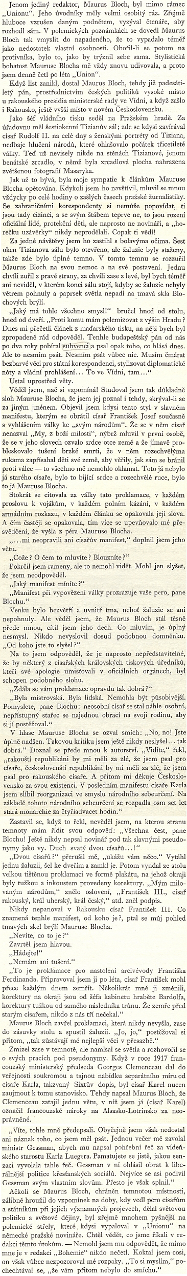 Dalším dokladem o Blochově významu přímo historickém svědčí tato pasáž z Tržiště senzací, vzpominkové knihy proslulého Egona Erwina Kische Repro E. E. Kisch, Tržiště senzací (1962), s. 77-81 |