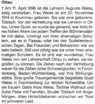 ![]() Nekrolog Auguste Weißové v krajanském měsíčníku Repro Glaube und Heimat, 1996, č. 9/10, s. 77 |
