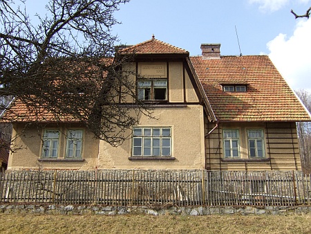 Dva záběry bývalé německé školy v Nové Peci při parkovišti nad místní částí Láz cestou k Plešnému jezeru z léta roku 2013 Foto Jan Mareš |
