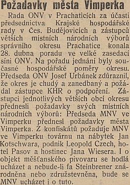 ![]() Město Vimperk v roce 1947 žádalo o objekty nejen Czechovy, ale i Kotschwarovy a Steinbrenerovy továrny Repro Šumavský hraničář, 1947, č. 21, s. 1 |