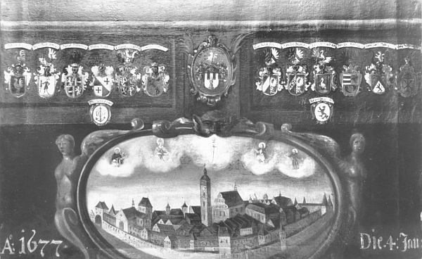 ![]() Dva hned rodové erby Daublebskych napravo od znaku města, zpodobeného i se svými nebeskými ochránci doleji, symbolizují význam patricijské "dynastie" pro barokové Budějovice Repro archív Kohoutího kříže |