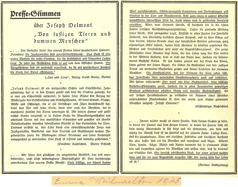 ![]() Hlasy tisku o jedné jeho knize, kterou dostala jakási paní či slečna Emma k Vánocům roku 1945 Repro J. Delmont, Von lustigen Tieren und dummen Menschen (1932) |