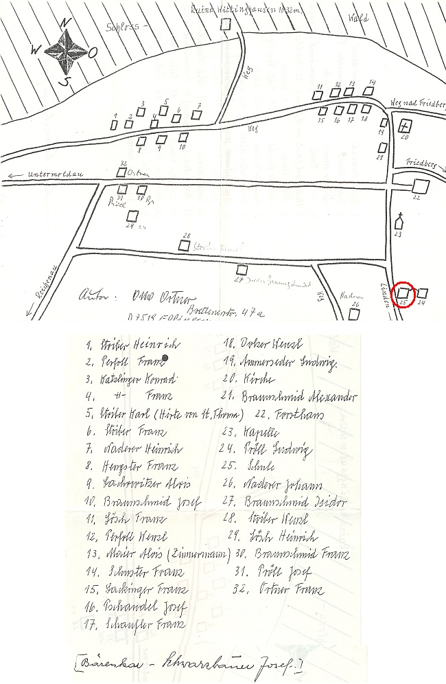Plánek, jehož autorem je Otto Ortner, zachycuje s orientací světových stran osadu Svatý Tomáš Repro archív paní Květy Cempírkové |