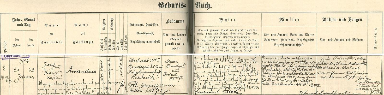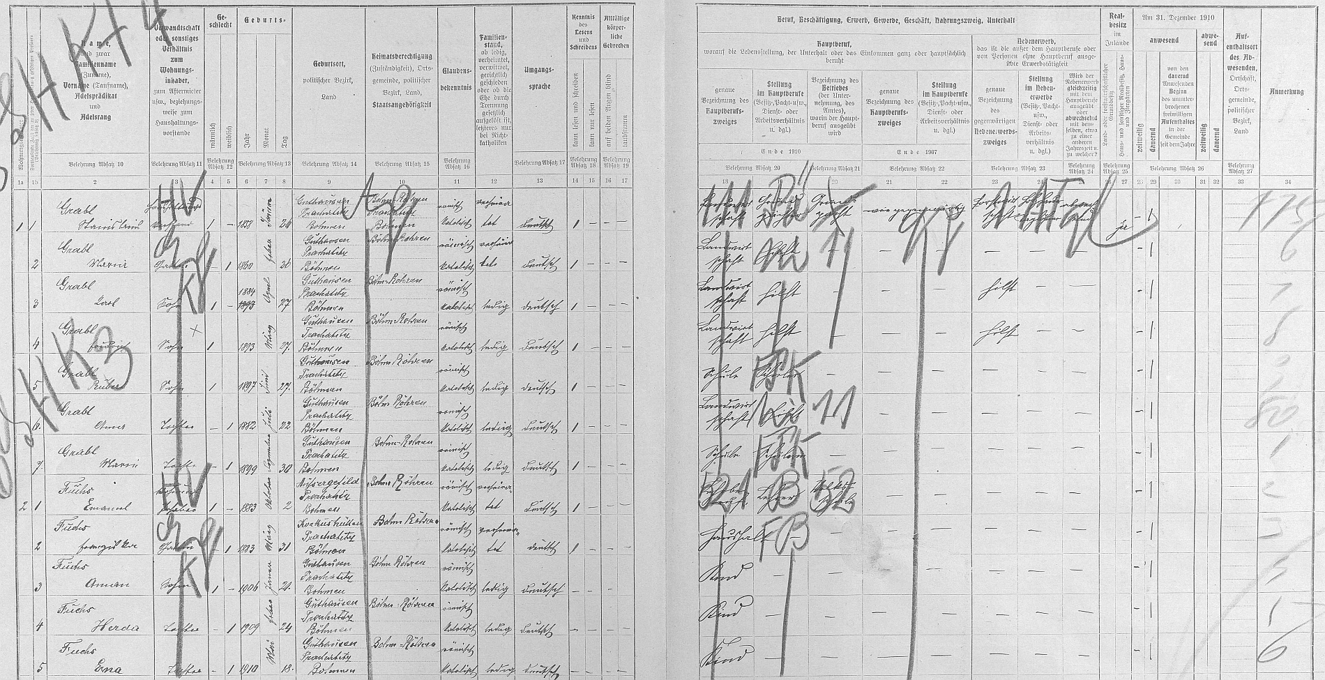 Arch sčítání lidu z roku 1910 pro stavení čp. 7 v Dobré na Šumavě s rodinou Fuchsovou i s ním, psaným se jménem "Aman", jako místo narození má ovšem uvedenou právě Dobrou Repro Sčítání lidu 1910, Dobrá na Šumavě, SOkA Prachatice (SOA v Třeboni - digitální archív) |