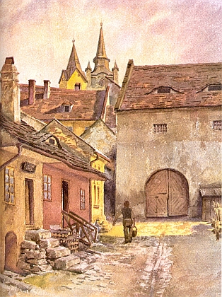 ![]() Dvůr fary ve Vimperku na akvarelu Wilhelma Fischera Repro H. Harwalik - F. Pimmer, Winterberg im Böhmerwald (1995), s. 447 |