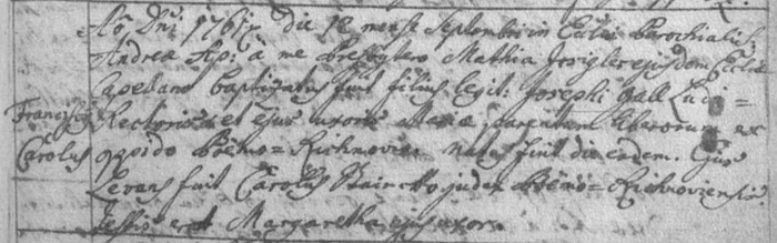 ![]() Záznam v křestní matrice farní obce Rychnov nad Malší o jeho narození Josephu a Marii Gallovým a křtu ve farním kostele sv. Ondřeje - už otec byl v "Českém Rychnově" školním "rektorem" Repro SOA v Třeboni - digitální archív |