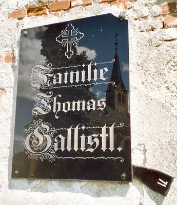 Česky psaný záznam zlatokorunské křestní matriky vypovídá o jeho narození v Domoradicích 5. prosince roku 1850 a křtu den nato ve Zlaté Koruně - otcem novorozence byl Anton Gallistl, sedlák z Domoradic čp. 3, syn sedláka z Chabičovic (zde "Kabičowic") čp. 2 Františka Gallistla a jeho manželky Anežky Pecho, sedlákovy dcery ze Zahrádky čp. 5, "patřící k c.k. podkraji Krumlowu", chlapcova matka Maria byla dcerou sedláka z Chabičovic čp. 1 Wáclawa Šimka a jeho ženy Anežky Hölzelové, sedlákovy dcery z Chabičovic čp. 6 - kmotry byli "Anton Saukup, sedlák z Mirkovic, a Kateřina Šimek, manželka jeho" Repro SOA v Třeboni - digitální archív |