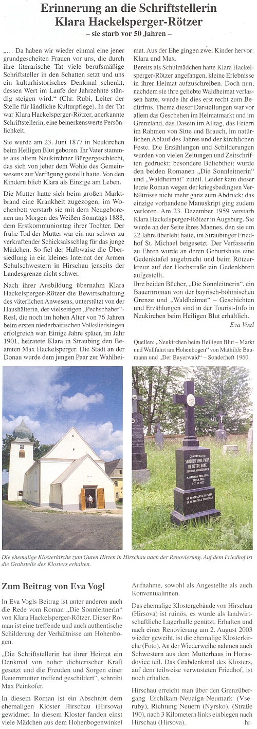 Vzpomínka na ni k 50. výročí jejího úmrtí na stránkách časopisu Der Bayerwald s připomínkou, že román Die Sonnleitnerin se zčásti odehrává v klášteře Školských sester de Notre Dame v Hyršově, kde kdysi nacházelo své povolání mnoho děvčat z "koutu při Vysokém Bogenu" (Hohenbogenwinkel), ať už jako civilní zaměstnankyně či řádové sestry Repro Der Bayerwald, 2008, č. 4, s. 37-38 |