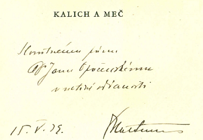 Vazba a patitul vydání jeho knihy "Kalich a meč" (Ed. Grégr, 1935) s věnováním překladatele Karla Hartmanna, jeho prasynovce Repro ze sbírky Petra Chabra |