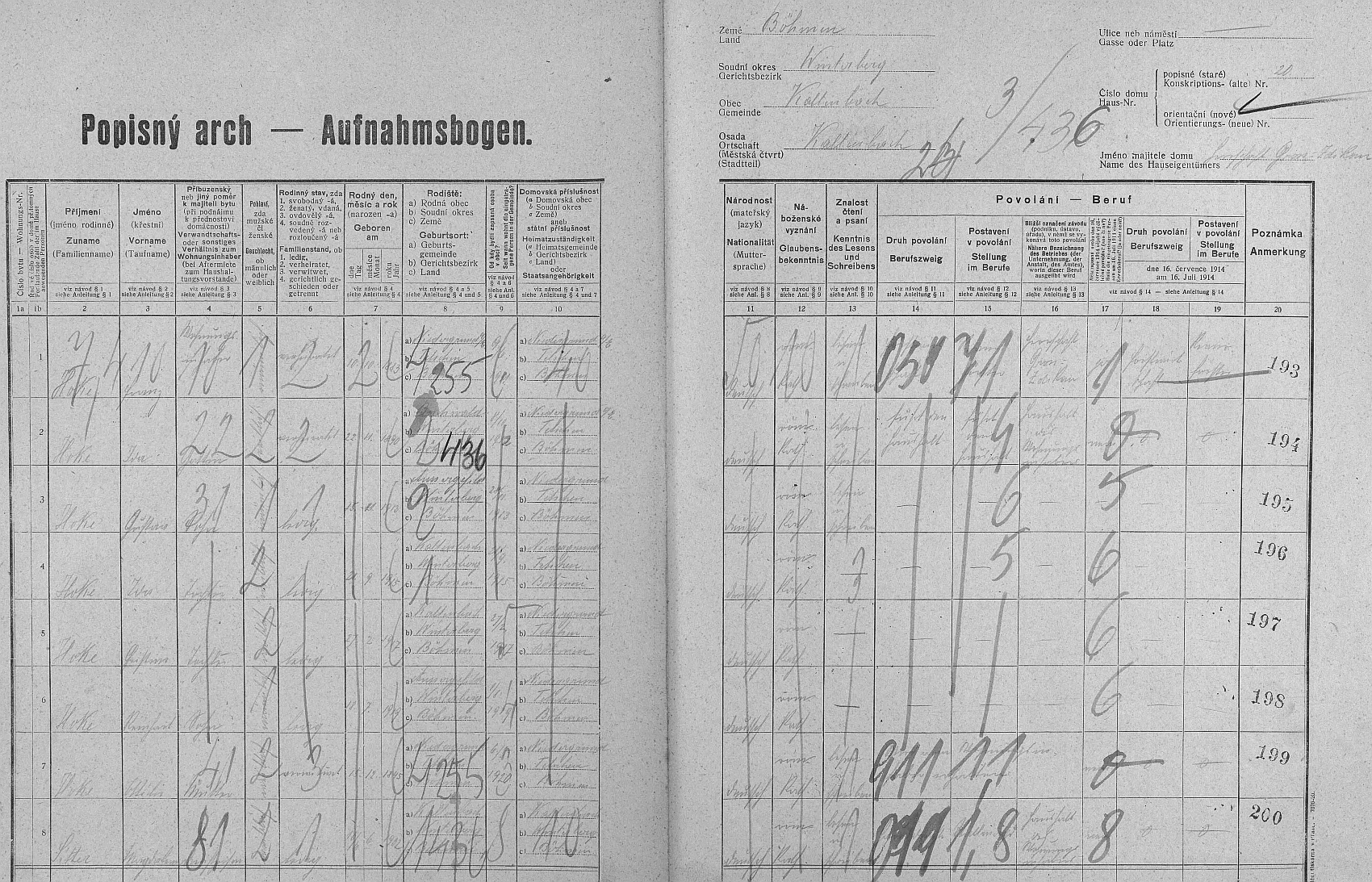 Arch sčítání lidu z roku 1921 pro stavení čp. 20 v Nových Hutích s jeho rodiči, sourozenci i s ním Repro Sčítání lidu 1921, Nové Hutě, SOkA Prachatice (SOA v Třeboni - digitální archív) |