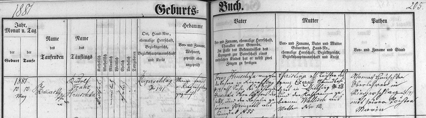 Záznam o jeho narození v křestní matrice farní obce Lodhéřov Repro SOA v Třeboni - digitální archív |