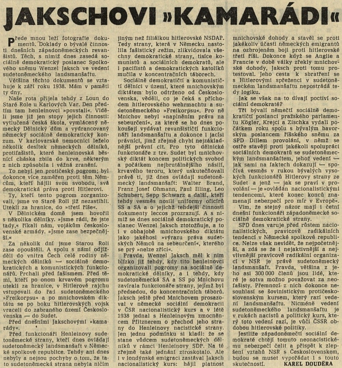 Na stránkách Rudého práva se ocitl i v pamfletu proti Wenzlovi Jakschovi, který jako sociální demokrat ležel komunistům v žaludku více nežli nacisté Repro Rudé právo, 15. 4. 1966, s. 3 |