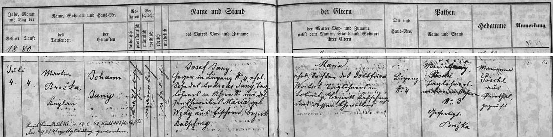 Narodil se 4. července 1880 hajnému Josefu Janymu ve Slupenci čp. 4 (synovi nádeníka Andrease Janyho v dnes částečně zničeném Záhorkově /Ahorn/ a Marie roz. Widyové ze zaniklého Stěžerova /Fischern/), a jeho ženě Marii, roz. Woitschové, dceři nádeníka Gottfrieda Woitsche z Lazce (Losnitz) - podle přípisu z ledna 1942 se stal pouhým "gottgläubig", tj. "věřícím v Boha" Repro SOA v Třeboni - digitální archív |