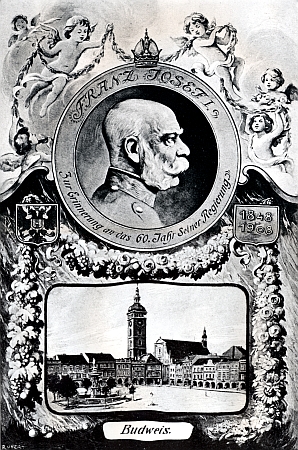 ![]() "Budějovická" pohlednice k 60. jubileu panování císaře Františka Josefa I. Repro ze sbírky Jana Töröka |