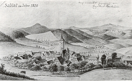 ![]() Kresba Záblatí v roce 1820 doprovázela v krajanském časopisu jeho text o místním hřbitově Repro Böhmerwäldler Heimatbrief, 2015, č. 9, s. 5 |