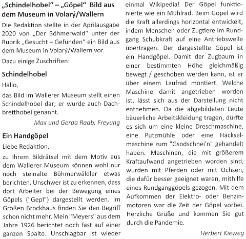![]() ![]() Hoblování střešních šindelů na exponátu muzea ve Volarech s jeho komentářem... Repro Der Böhmerwald Heimatbrief, 2020, č. 5, s. 39 |